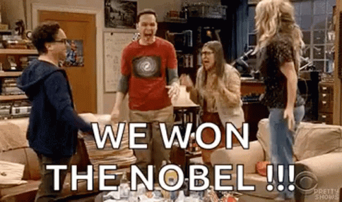 Sheldon, Penny, Amy, and Leonard from The Big Bang Theory celebrate their Nobel win with an excited group hug.