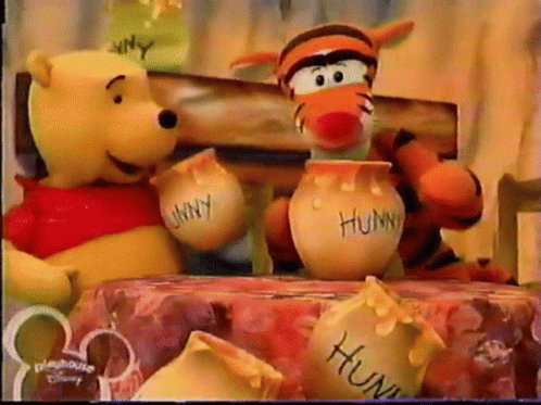 Winnie the Pooh and Tigger enjoy honey from their pots, surrounded by more honey.