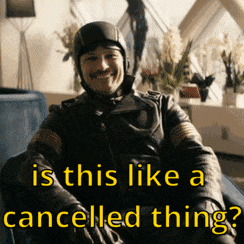 A character from The Boys, wearing a helmet, asks if he is being cancelled in a humorous moment.