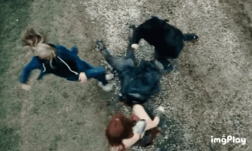 Aerial view of an intense group fight scene from The Boys, featuring characters like Kimiko, Queen Maeve, and Starlight, with a powerful kick.