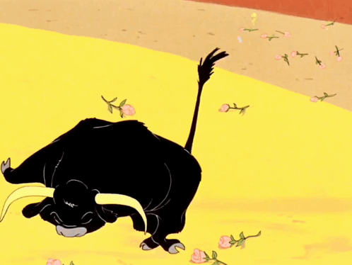 A cartoon bull from The Bugs Bunny and Roadrunner Movie bows and then charges in a yellow arena.