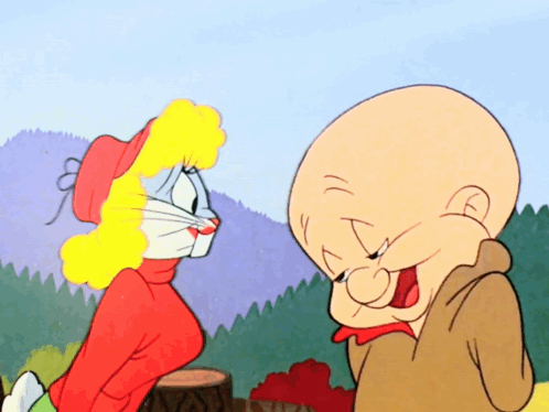 Bugs Bunny, disguised as a blonde woman, surprises Elmer Fudd with a kiss in this classic cartoon moment.