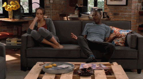 A man and a woman from The Carmichael Show sit on a couch, engaged in conversation.
