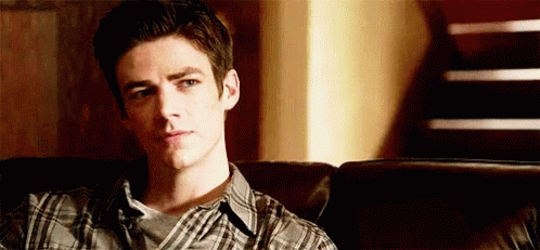 Grant Gustin as Barry Allen from The Flash, smiling while sitting on a couch in a plaid shirt.