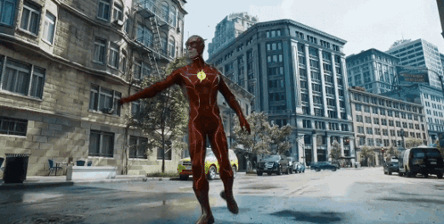 The Flash, the iconic superhero, captured mid-sprint through a bustling city street.
