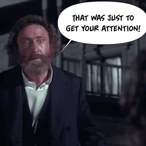 Gene Wilder as a bearded rabbi in The Frisco Kid, pointing and exclaiming "That was just to get your attention!"