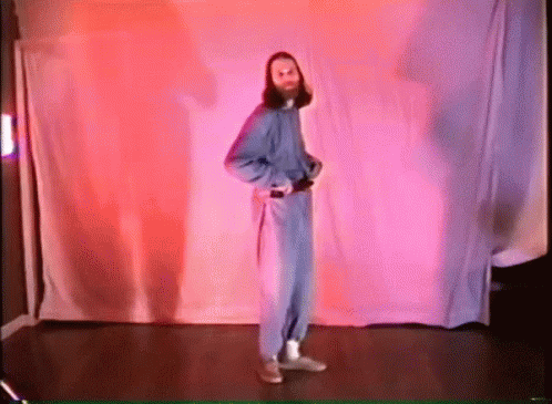 The Handy Man performs a quirky dance, moving his arms and legs in front of a pink and white curtain.