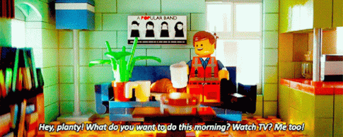 Emmet from The Lego Movie enjoys his morning routine, asking his plant about watching TV.