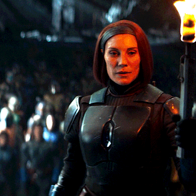 Bo-Katan Kryze, portrayed by Katee Sackhoff, holds a lit torch, looking intently in a scene from The Mandalorian.