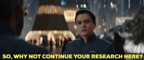 Elia Kane from The Mandalorian asks, 'Why not continue your research here?' in a futuristic setting.
