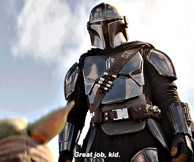 The Mandalorian (Din Djarin) praises Grogu with 'Great job, kid' in a heartwarming scene.