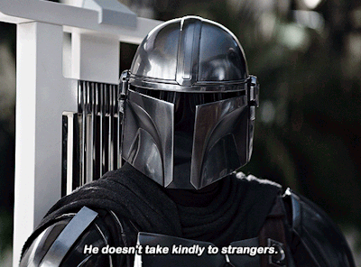 Din Djarin, The Mandalorian, delivers his iconic line: 'He doesn't take kindly to strangers.'