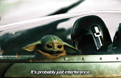 Grogu, also known as Baby Yoda, sits beside Din Djarin (The Mandalorian) in the cockpit, hearing a strange signal.