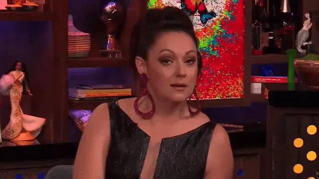 Fran Fine, played by Fran Drescher, in a vibrant red shirt, dancing in a beauty salon, joined by Sylvia Fine.