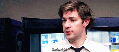 Jim Halpert from The Office acknowledges a statement by saying 'You're right' with a subtle expression.