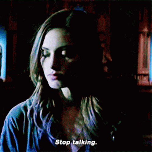 Hayley Marshall (Phoebe Tonkin) from The Originals delivers a stern 'Stop talking' in a dramatic close-up.