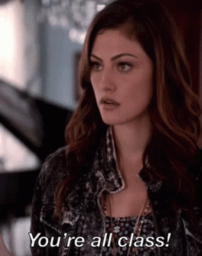 Hayley Marshall (Phoebe Tonkin) from The Originals delivers the line 'You're all class!' with a serious expression.
