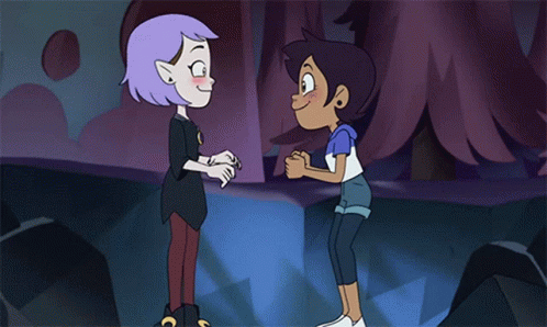 Amity Blight and Luz Noceda from The Owl House share a sweet, blushing moment while holding hands.
