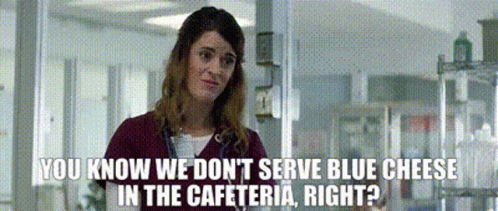 Mary Holland from The Package questions the lack of blue cheese in the cafeteria, delivering a memorable line.