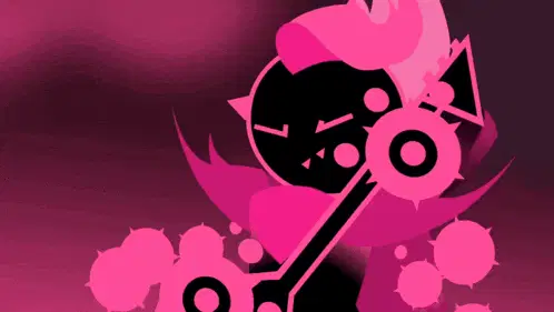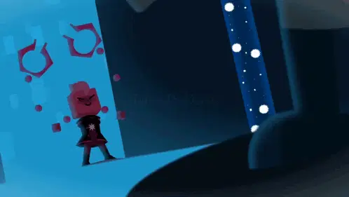 A red cube character from The Pink Corruption (TPC) animation changes its expression from happy to surprised.