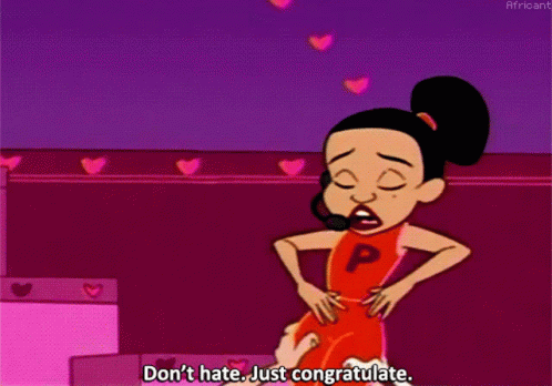 Penny Proud from The Proud Family performs, held aloft by fans, exclaiming 'Don't hate. Just congratulate!'