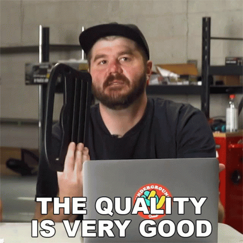 James Pumphrey holds a chair in front of a laptop displaying 'The Quality Is Very Good' text.