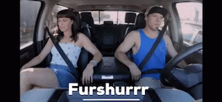 A man and woman in a car, with the text 'Furshurrr' displayed on screen.