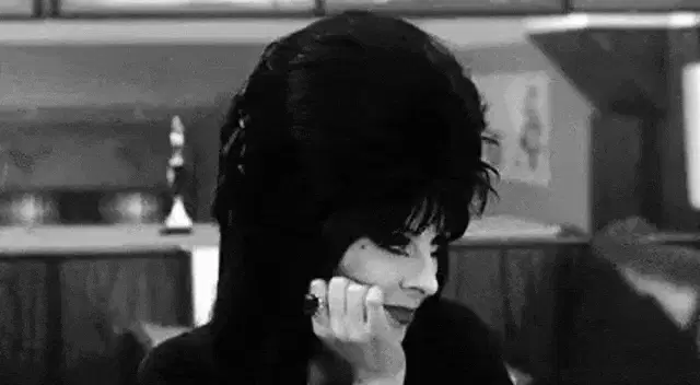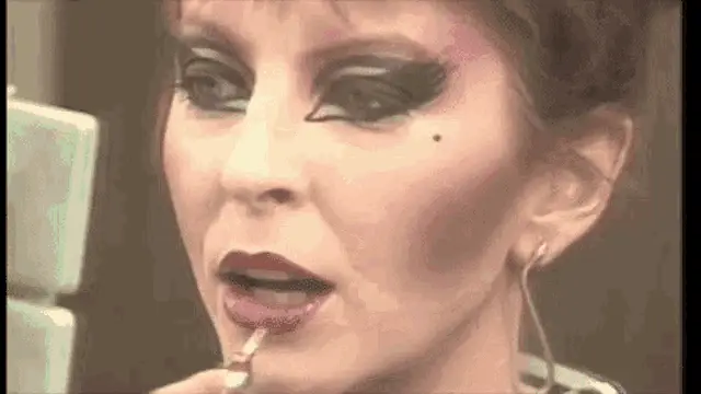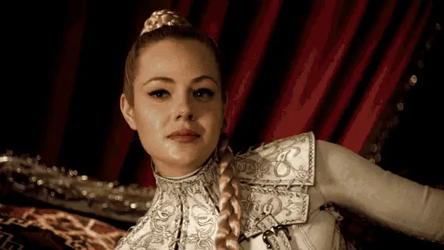 The Seeker Mistress in an elegant white costume with a braid, posing against a vibrant red curtain.