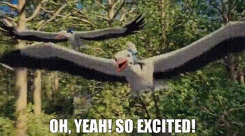 A Smurf flies on a bird, exclaiming 'Oh, Yeah! So Excited!' in a moment of pure joy and excitement.