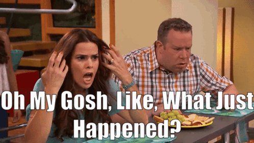 Barb Thunderman and a man react in shock, exclaiming 'Oh My Gosh, Like, What Just Happened?'