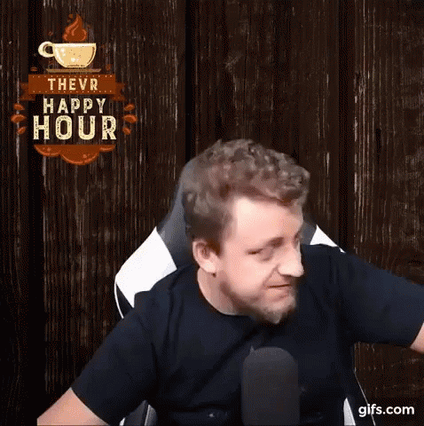 A man from The VR Happy Hour makes an awkward expression, then smiles, in front of the show's logo.