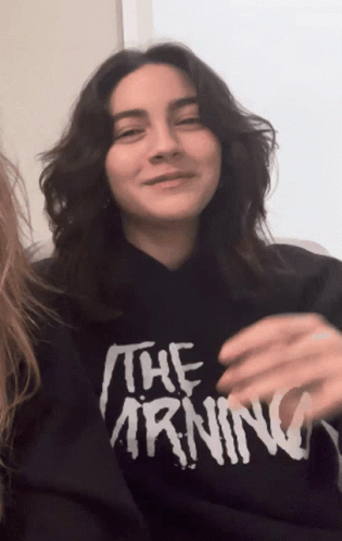 Ale Villarreal, wearing a 'The Warning' hoodie, smiles and makes an OK hand gesture.