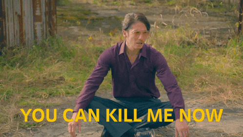 a man in a purple shirt sits on the ground with the words " you can kill me now " written in yellow