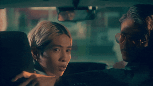 a man and a woman are sitting in a car and the woman is wearing glasses