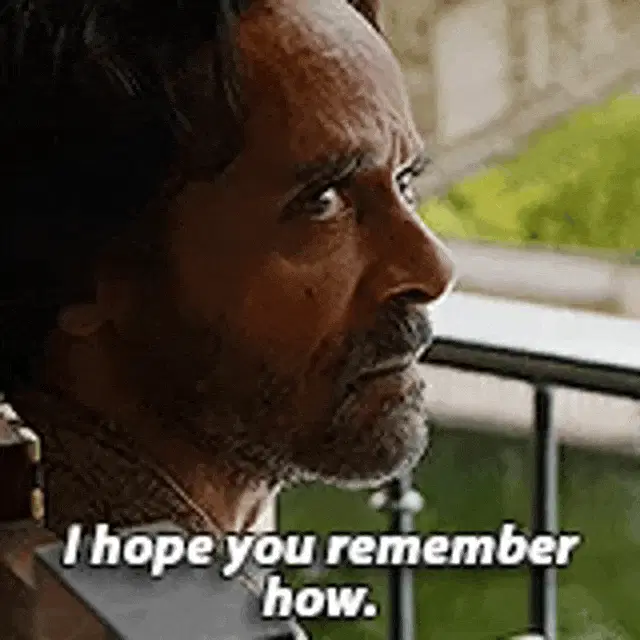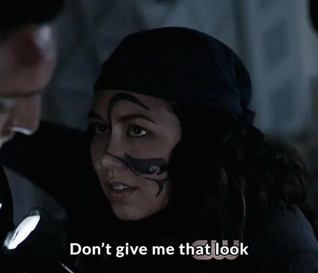 Emori from The 100, with a distinctive face tattoo, tells a man, "Don't give me that look."