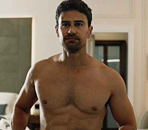 Theo James, as Cameron Sullivan, shirtless in a scene from The White Lotus, looking directly at the camera.