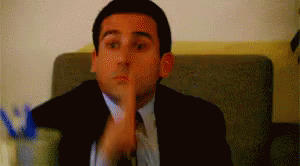 Michael Scott from The Office reacts with a 'no' gesture while sitting on a couch.