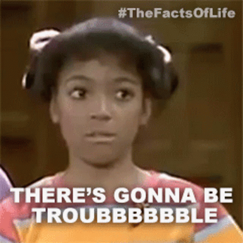 Kim Fields as Tootie Ramsey from The Facts of Life makes a wide-eyed expression with the caption "THERE'S GONNA BE TROUBBBBBLE".