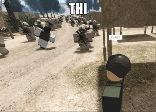 Roblox military figures marching in a desert setting, with text 'THI' and 'CHRIST' visible.