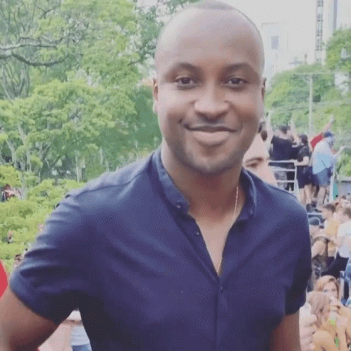 Thimoji Thimojis smiles and winks while holding several Trident gum packs at a lively Carnaval event.