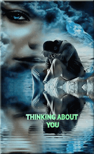 A man sits contemplatively on a rock in water, with an ethereal face in the background, expressing 'Thinking About You'.