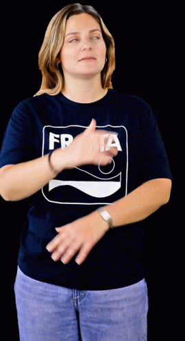 A woman in a Frosta t-shirt ponders thoughtfully, making an 'Hm' expression.