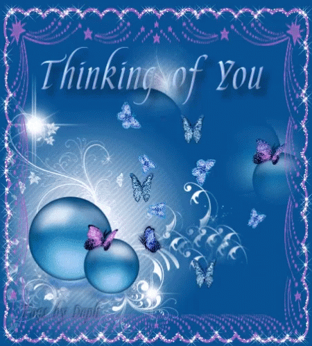 A beautiful animated greeting card featuring sparkling blue glitter and delicate butterflies, with the message 'Thinking Of You'.