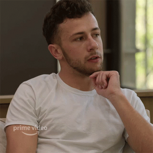 Taylor, a man with a beard, is seen pondering deeply while wearing a white Prime Video t-shirt.