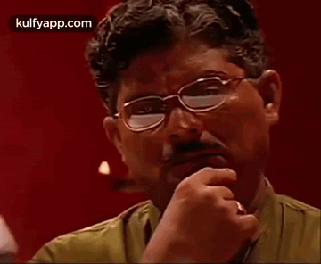Jagathy Sreekumar, wearing glasses and a mustache, is seen deep in thought, contemplating a situation.