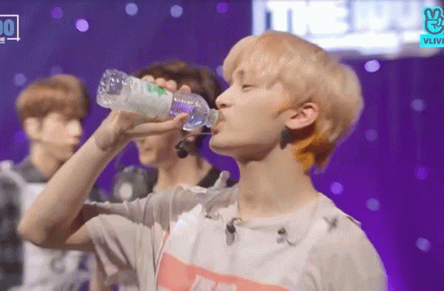 The Boyz member Juhaknyeon drinks water from a bottle on stage during a performance.