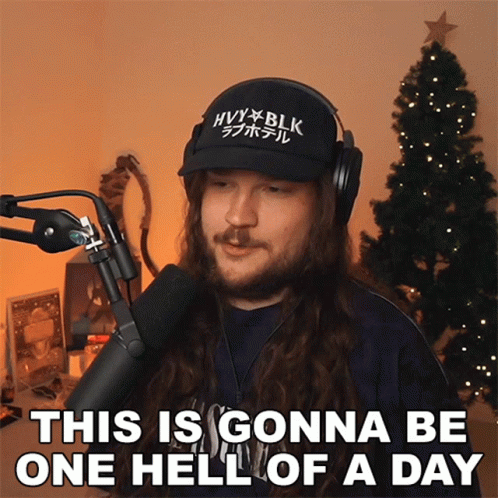 Spaceboy, wearing headphones and a hat, declares, 'This is gonna be one hell of a day' in front of a Christmas tree.