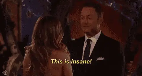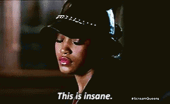 A character from Scream Queens, wearing a stylish hat, reacts with shock, exclaiming 'This is insane'.