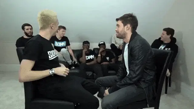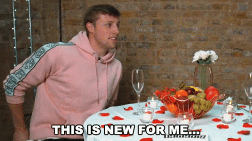 A man from Sidemen, wearing a pink hoodie, sits at a romantic table setting with fruit, expressing 'This Is New For Me...'