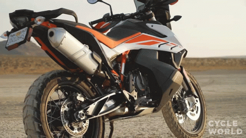 A black and orange KTM 790 Adventure R motorcycle parked on a dirt road, featured by Cycle World.